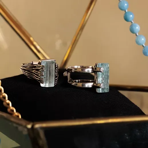 Featuring a stunning rectangular aquamarine gemstone, this ring is crafted from high-quality sterling silver, ensuring a sleek, polished finish that will last. The unique double-stacked design adds depth and dimension, creating a striking layered effect that draws attention and enhances the natural clarity of the aquamarine.