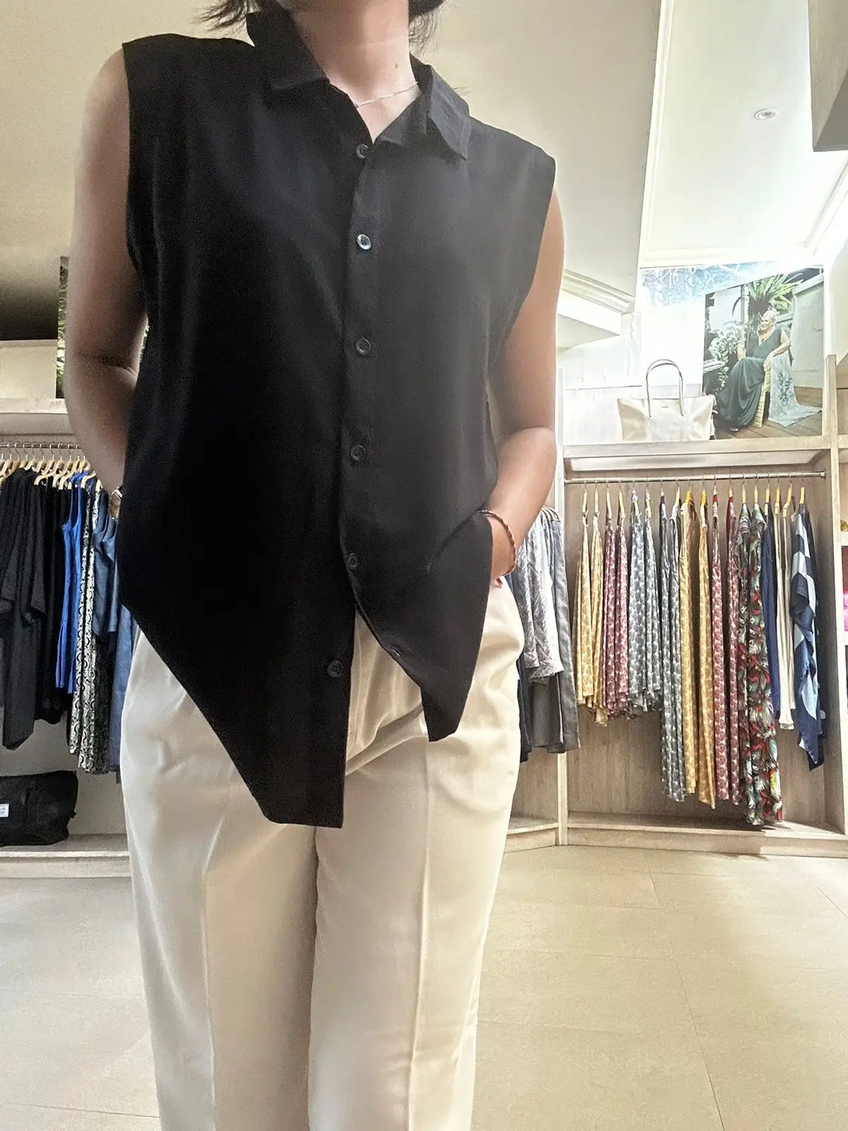 MN Top Our fitted sleeveless shirt is made in the cool 100% Rayon Super fabric. Designed with a classic collar and V-shaped opening with pearly buttons. A super easy style to pair with any outfit and dress up or for casual wear.